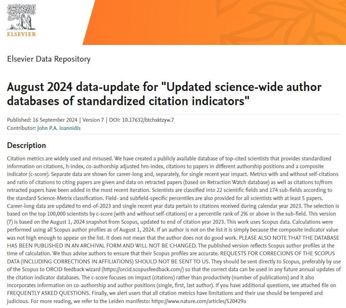 The World's Top 2% Scientists List is based on a systematic analysis of citation data from the Scopus database. It uses six key factors for scoring, including total citations (distinguishing between self-citations and citations from others, and providing self-citation data), Hirsch H-index, co-author corrected Schreiber Hm-index, single author, single or first author, etc. It selects scientists ranking in the top 2% in the world from nearly 7 million scientists globally, covering 22 fields and 174 sub-fields. It provides a measure for scientists' long-term scientific research performance and can reflect scientists' influence more objectively and truly. The career scientific influence list (Career) counts the comprehensive performance of scientists during their career, while the annual scientific influence list (Singleyr) focuses more on the academic influence in the previous year. Being selected into the list means that the scholar has a relatively high world influence in his research field.
