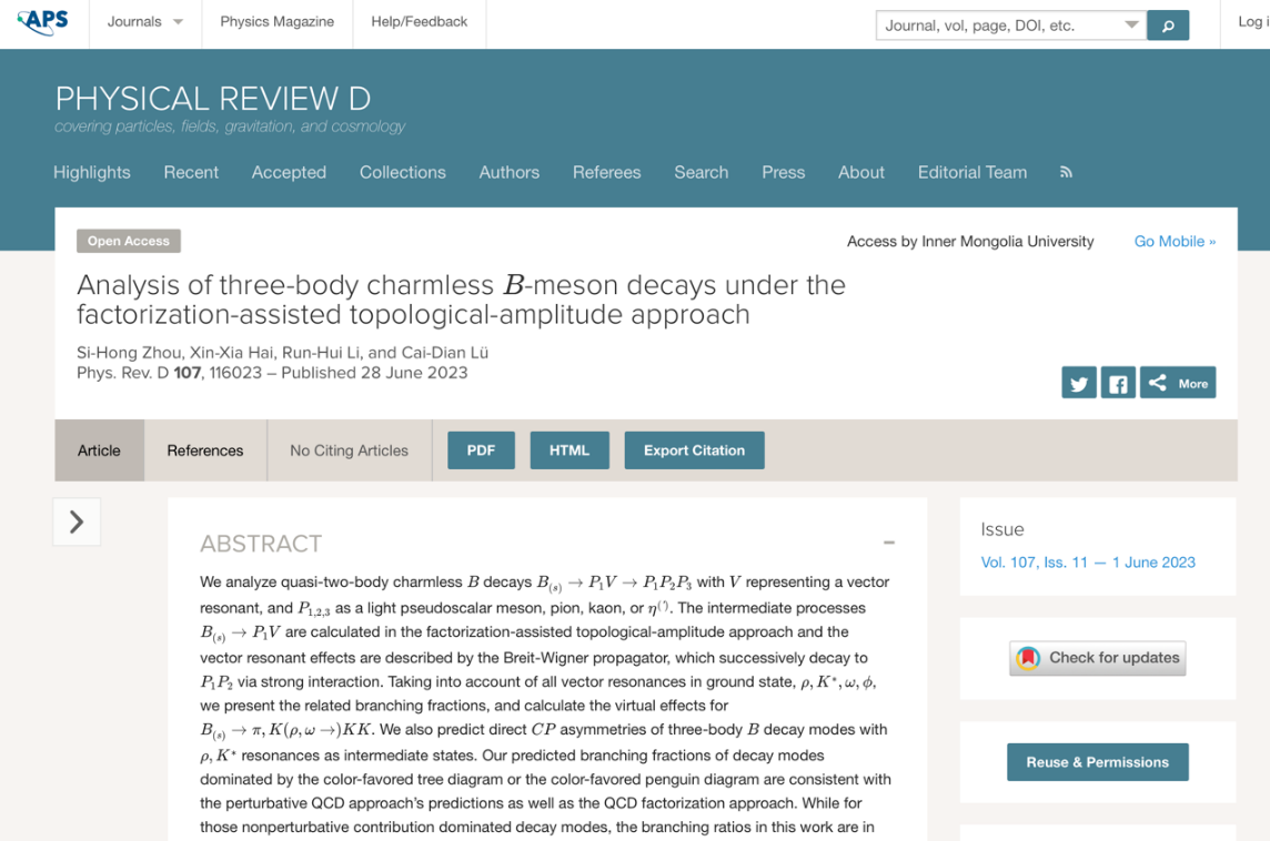 Recently, Associate Prof. Zhou Sihong with the School of Physical Science and Technology of IMU, has published, in the international top physical journal-Physical Review D whose effect factor issued by Clarivate is 5.0 and that is in the first section of WOS journal categorization, the latest research results in the three-body charmless heavy B-meson decays. The article is titled “Analysis of three-body charmless B-meson decays under the factorization-assisted topological-amplitude approach”. The url of the article is https://journals.aps.org/prd/abstract/10.1103/PhysRevD.107.116023.