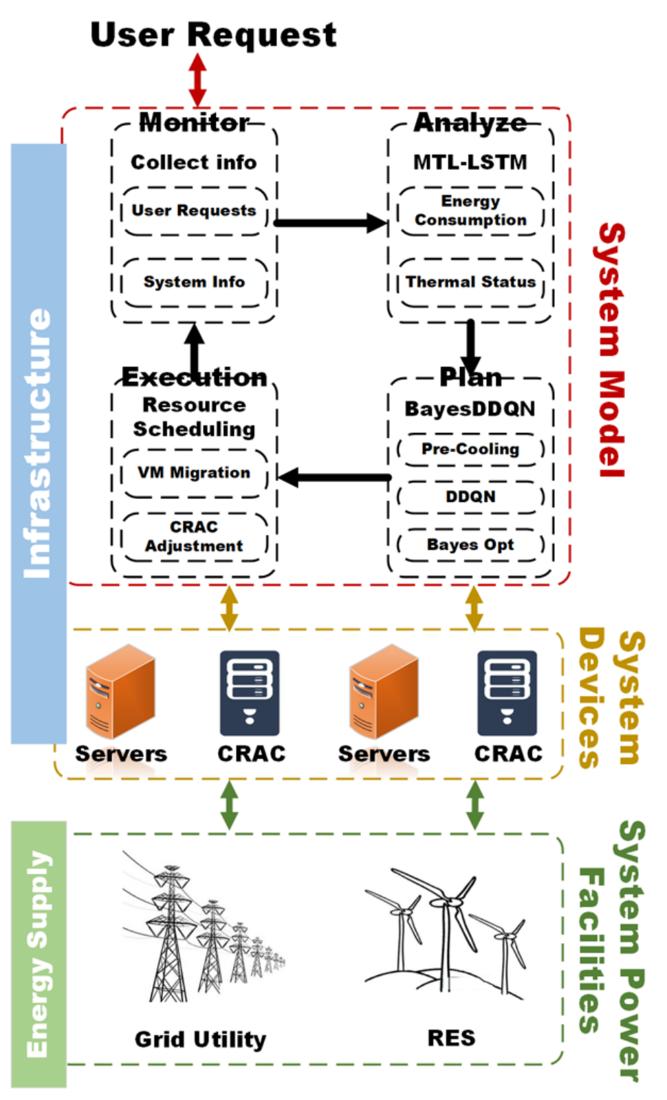 The rapid growth in the scale and number of cloud data centers has led to significant increases in energy consumption and carbon emissions. Major cloud service providers have started exploring hybrid power sources, combining traditional electricity with renewable energy to power cloud data centers. However, due to the randomness of resource requests and the volatility and intermittency of renewable energy, cloud data centers utilizing hybrid power often face issues such as excessive virtualization or overcooling, leading to overall energy waste. To address this issue, the paper proposes a deep reinforcement learning-based framework for optimizing the overall energy consumption of cloud data centers, based on the "MAPE" (Monitor, Analyze, Plan, and Execute) design principles.