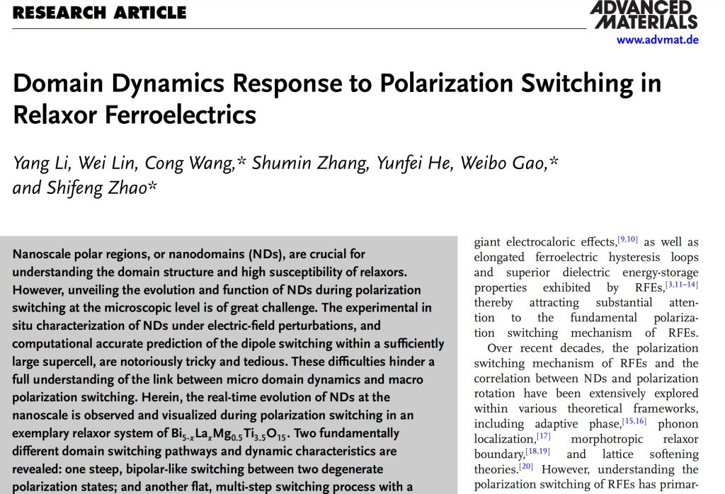 这项工作在微观的畴动力学与宏观极化切换之间构筑起一座桥梁,不仅对精确和有针对性的操纵极化切换提供了宝贵的洞见,还为弛豫铁电体针对于不同实际应用的按需设计提供了的富有成效的指导。