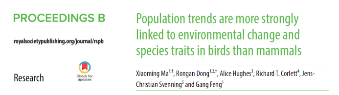 近日,生态与环境学院冯刚教授在全球鸟类与兽类种群动态变化及其影响因素方面取得了最新进展。研究成果以“Population trends are more strongly linked to environmental change and species traits in birds than mammals”为题,发表于学科卓越期刊《Proceedings of the Royal Society B: Biological Sciences》(Nature指数收录)。