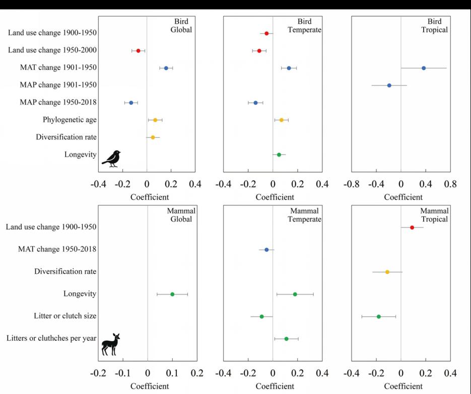 图1空间自回归模型的系数展示了各种变量与全球尺度、热带和温带地区鸟类及哺乳动物种群趋势之间的关联。图中的圆点表示每个变量的标准化系数值,红色代表土地利用变化,蓝色代表气候变化,黄色代表物种的系统发育特征,绿色代表物种的功能性状。圆点两侧的实线表示标准化系数的95%置信区间。如果95%置信区间没有与灰色的零线重叠,则该变量与种群丰度动态之间存在显著关联(p值小于0.05)。