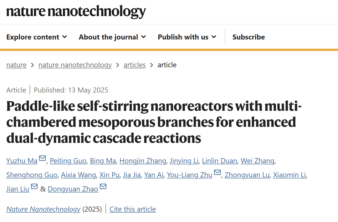 5月13日,我校能源材料化学研究院赵东元院士、马玉柱教授、化学化工学院刘健教授联合吉林大学吕中元、朱有亮教授等人在Nature Nanotechnology期刊上发表了题为“Paddle-like self-stirring nanoreactors with multi-chambered mesoporous branches for enhanced dual-dynamic cascade reactions”的研究成果。