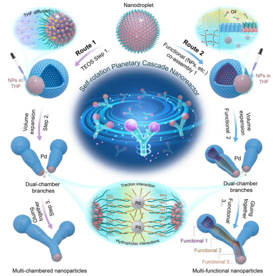 赵东元院士团队通过纳米液滴膨胀和随后的融合策略,设计了一种具有分支多腔结构的桨状介孔纳米反应器(图1),利用分步封装策略可以将功能组分,如Fe?O?纳米颗粒、Pd纳米晶、上转换NaGdF?纳米颗粒(~20 nm)等植入到特定的位置,从而在单粒子水平上构建壳-室、上-下腔和左-右腔分离的杂化二元、三元和四元多功能级联纳米反应器。