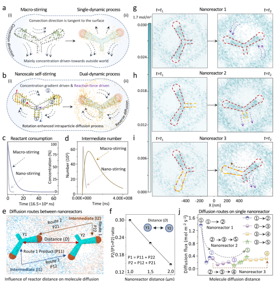首先,每个分支纳米结构在体系中同时旋转,相当于无数个小转子同时搅拌,从而显著增强反应效率。其次,纳米反应器的自转过程,不仅可以驱动分子由高浓度到低浓度的自发扩散。同时自转过程可以产生指向内腔的反作用力,从而大大增强内扩散过程,甚至可以驱动分子从低到高浓度的反向扩散。这种双动态驱动模式增加了中间体到达下一个活性位点(Au,如本研究中)的概率,从而带动分子的定向扩散。这也调控了分子到达下一位点的概率,进一步优化分子扩散路径,提高产物选择性(图2)。
