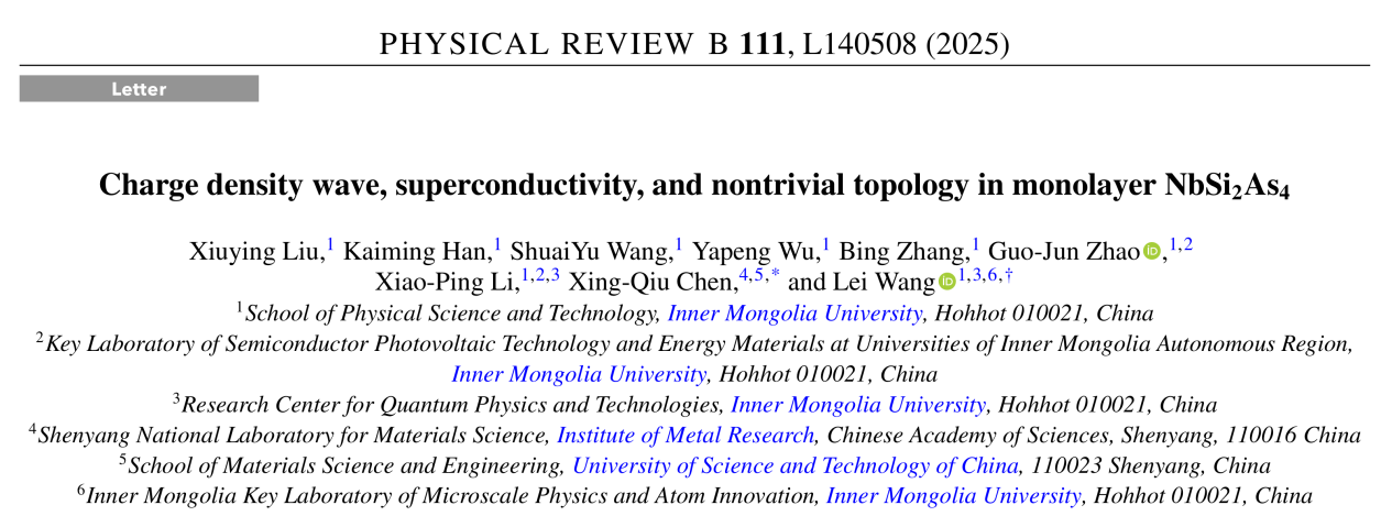 近日,k8凯发物理科学与技术学院王磊研究员课题组与中国科学院金属研究所陈星秋研究员合作指导研究生在二维量子材料领域取得新进展。研究团队通过理论计算预测了一种新型单层材料NbSi2As2,并提出其基态电荷密度波(CDW)与超导性和非平庸拓扑性质共存的可能性。该研究为探索多体量子序的相互作用及拓扑超导器件的设计提供了潜在新平台。相关成果以“Charge density wave, superconductivity, and nontrivial topology in monolayer NbSi2As4”为题以快报的形式发表在2025年4月23日出版的物理学知名期刊《Physical Review B》。