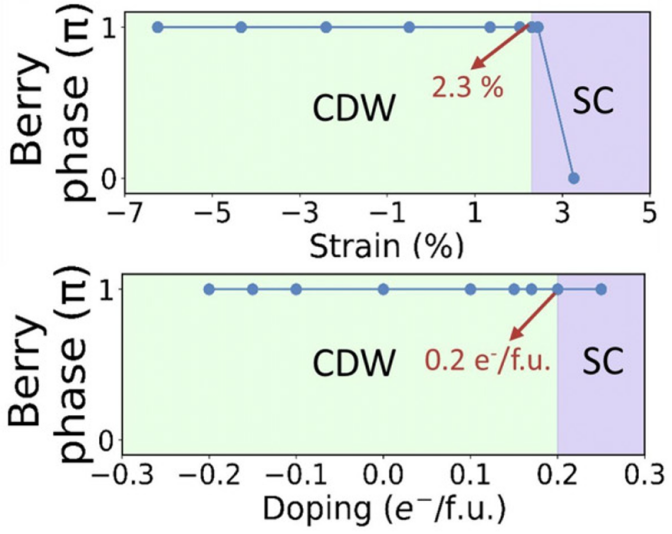 凝聚态物理中电荷密度波、超导性和拓扑性质是备受关注的前沿方向,而它们在单一材料中的共存及相互作用更是研究热点。研究团队发现,NbSi2As2单层作为一种新型二维材料,其晶体场和费米面拓扑与2H-NbSe2具有相似性,但表现出更复杂的轨道杂化和能带交叉,促使了拓扑性的出现。其基态为CDW相,CDW不稳定性主要源于铌(Nb)的d轨道与纵向声学声子的电声耦合作用。通过电子掺杂或施加拉伸应变,可以抑制CDW不稳定性,从而使其转变为超导态,临界温度分别为5.73 K 和5.11 K。该工作在单一材料中实现了基态CDW、超导性和非平庸拓扑态的共存,为探索多体相互作用与拓扑物理的协同效应提供了新平台。