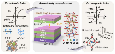 该工作提出的几何策略,通过解耦BO6氧八面体的几何相关畸变来诱导和耦合不适当的铁电性和垂直磁各向异性,并在La2NiMnO6/La2CoMnO6双钙钛矿超晶格中得到了系统的实验验证。强铁磁性和室温铁电性的共存得益于铁磁超交换相互作用下HIF机制的电子不相容性的减弱。PMA来源于自旋轨道耦合(SOC),并受JT畸变引起的晶体场分裂的调控。实验结果进一步揭示了垂直磁结构的微扰理论及其极化路径下调节的交换模型。这一几何策略为解决类似多铁共存悖论及构建特殊铁性序的物理问题提供了全新的介观尺度研究思路。