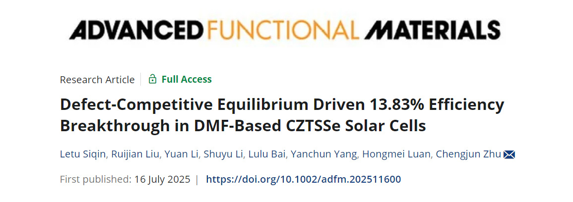 近日,我校物理科学与技术学院,内蒙古自治区半导体光伏技术与能源材料重点实验室朱成军教授团队在锌黄锡矿铜锌锡硫硒(CZTSSe)薄膜太阳能电池研究领域取得重要研究进展,在国际顶级期刊Advanced Functional Materials(《先进功能材料》SCI一区TOP,自然指数期刊,IF:19,论文链接:https://doi.org/10.1002/adfm.202511600)上发表题为“Defect-Competitive Equilibrium Driven 13.83% Efficiency Breakthrough in DMF-Based CZTSSe Solar Cells”的研究成果。论文以k8凯发为唯一通讯单位,朱成军教授为该论文的独立通讯作者,物理学博士研究生斯琴勒图为该论文第一作者,刘瑞建讲师和硕士研究生李源为共同一作。