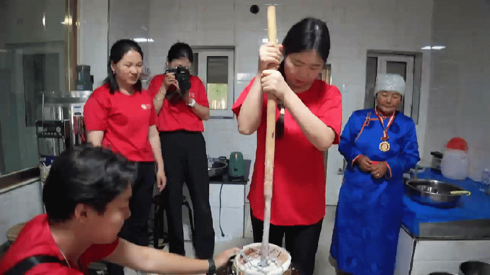 在巴音淖尔草原乌审旗阿日贡苏奶食品店,实践团在“乌审奶食品传统制作技艺”传承人哈斯苏都老师的传授引导下,体验了奶食品的传统制作技艺。在陶罐中放入新鲜牛奶,通过不断捣动分离出乳清和奶油,提炼出白酥油。品尝到自己制作的白酥油,实践团成员的内心充满了幸福感和获得感。