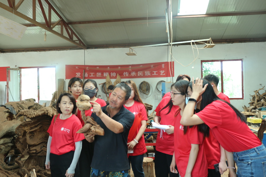 在蒙古族传统手工艺加工制作技能传承实训基地,在“乌审雅西乐雕刻”传承人达布希拉图老师的带领下,实践团参观了雅西乐雕刻工厂和艺术展馆。在雕刻工厂,实践团看到木雕、根雕作品制作过程,正在进行的根雕创作“猪八戒背媳妇”等已具备雏形。在艺术展馆,展翅的雄鹰、真假美猴王、匍匐的蜥蜴等栩栩如生,特别引人注目。传承人介绍木雕工艺时嘱咐在场的同学们“年轻人做事要坚持到底,半途而废就是失败”。雅西乐作品的制作是从发现材料、理解材料、艺术创作到精心打磨的漫长过程,任何一个步骤的放弃,都会失去一件珍贵的艺术品。实践团在这里不仅感受雅西乐艺术的魅力,而且学习到了一丝不苟、持之以恒的工匠精神。