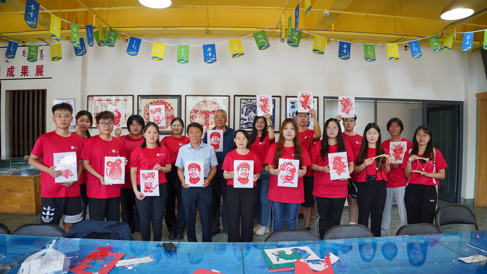 在乌审旗文化产业园区的自治区传统工艺工作站乌审旗分站,实践团传习体验了刺绣、剪纸、熟皮制作工艺。在“蒙古族刺绣”传承人乌东高娃老师、“剪纸”传承人边俊杰老师、“蒙古族传统熟皮制作技艺”传承人额尔德尼巴雅尔老师的悉心指导下,实践团成员经认真观摩和动手制作,用手中的针线穿出雕花的刺绣,用手中的剪刀裁出十二生肖像,用手中的皮条编出皮鞭。手里捧着自己的作品,实践团成员情不自禁漏出满意的笑容。最终成品虽不算精美,却能烙下师生自己的印记。